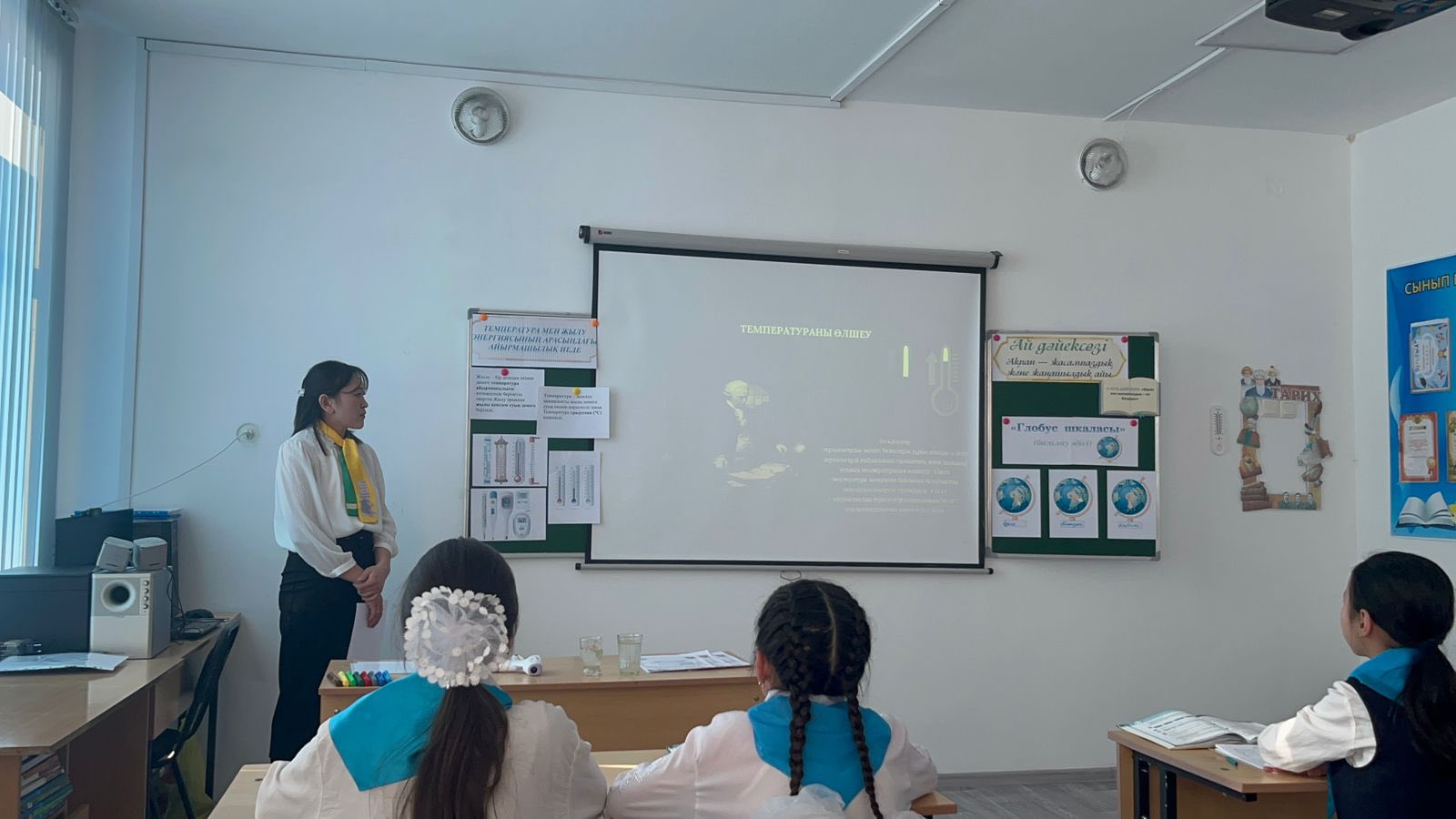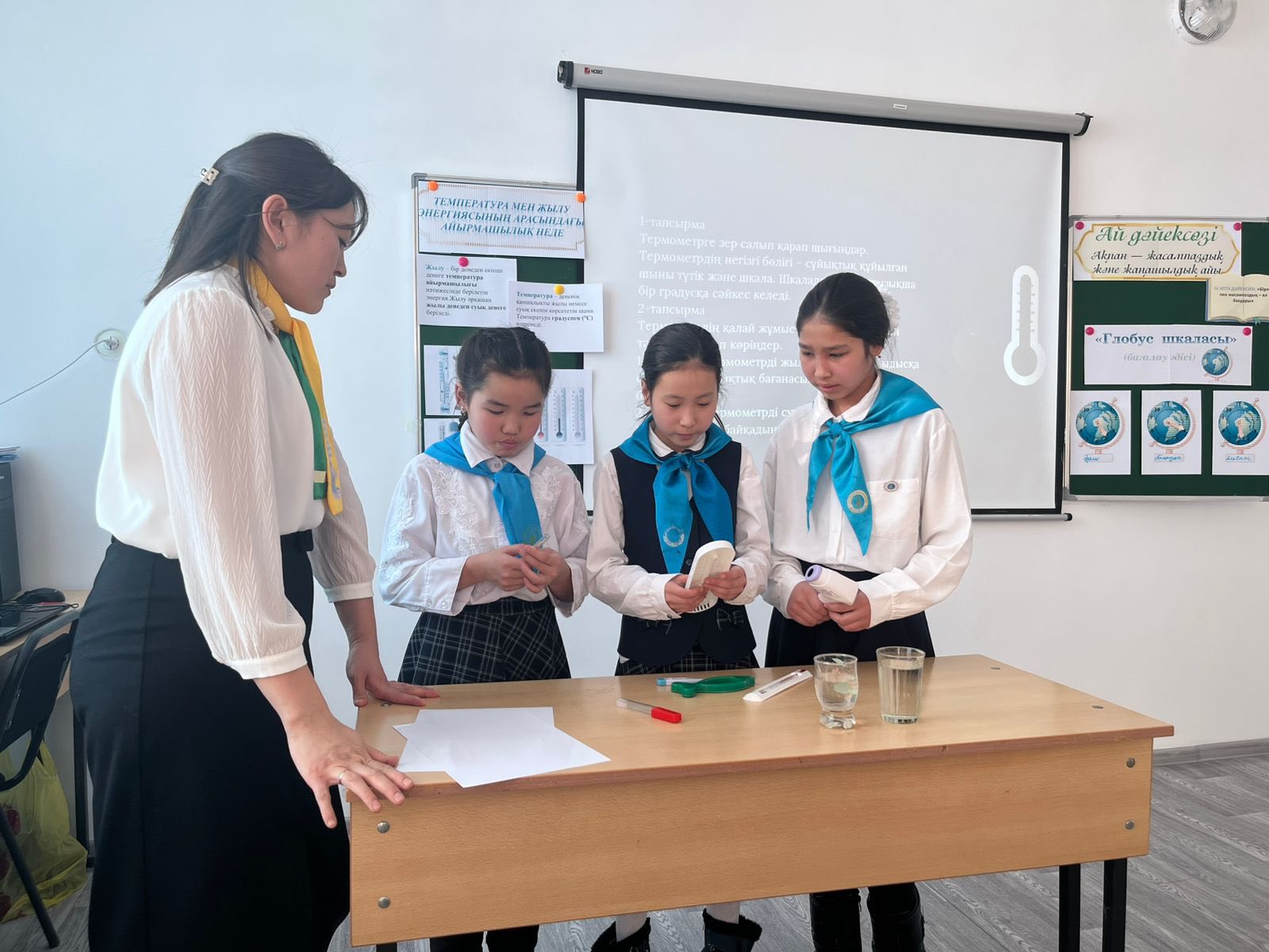 25 ақпан күні Жаратылыстану-математика пәндер бірлестігінің апталығы аясында жаратылыстану пәні мұғалімі Асылзат Азаматқызы 5-сынып оқушыларымен «Температура мен жылу энергиясының айырмасы» тақырыбында ашық сабақ өткізді.
