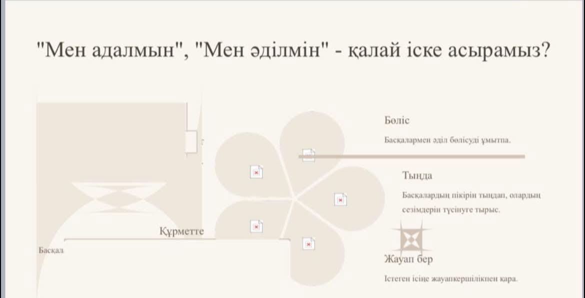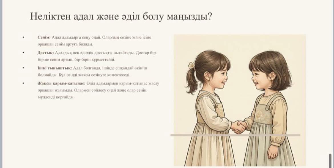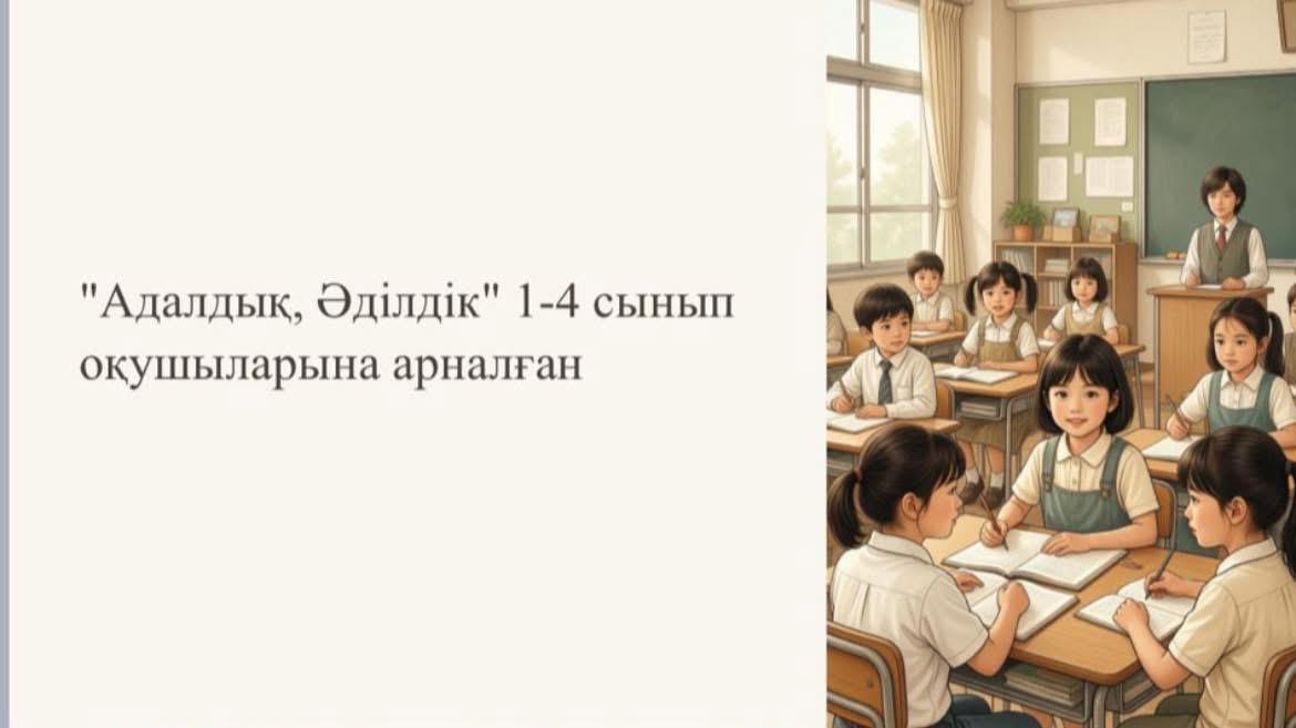 Бастауыш сынып мұғалімдері «Адалдық, әділдік» тақырыбында онлайн дәріс өткізді. Дәріс оқушылардың бойында адалдық пен әділдік құндылықтарын қалыптастыру, дұрыс пен бұрысты ажырата білуге, шыншыл, жауапкершілігі жоғары, әділ шешім қабылдай алатын тұлға болып өсуіне ықпал етпек.