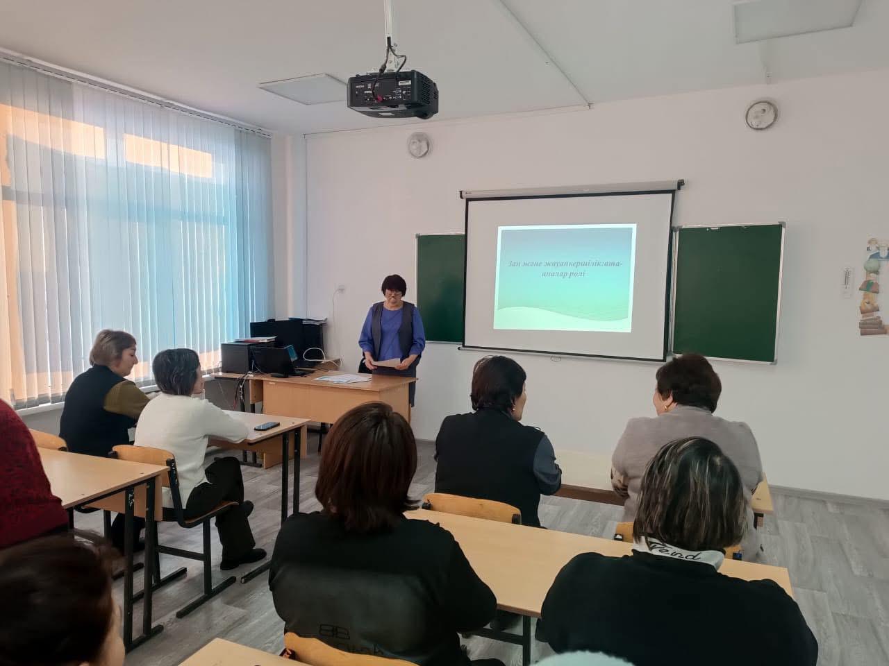 “Заң және тәртіп” айлығы аясында бастауыш сынып мұғалімі Мукажанова Г.К. ата-аналармен “Жауапкершілік және заң” тақырыбында жиналыс өткізді. Жиналыс барысында оқушылардың құқықтары мен міндеттері, ата-аналардың бала тәрбиесіндегі заң алдындағы жауапкершілігі, сондай-ақ мектеп пен отбасының бірлескен жұмысының маңыздылығы туралы айтылды.
