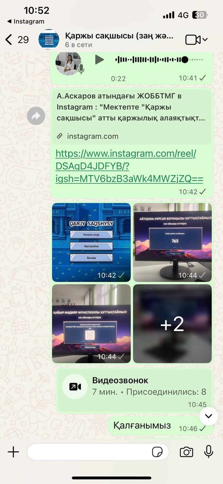 “Заң және тәртіп” айлығының жоспарына сәйкес бүгін Қалым Г.А мектеп оқушыларына алаяқтықтың алдын алу мақсатында ойнатылатын “Қаржы сақшысы” ойыны туралы онлайн форматта ақпарат берді. Кездесу барысында оқушыларға қаржылық қауіпсіздік, интернет алаяқтық түрлері және олардан сақтану жолдары түсіндірілді.